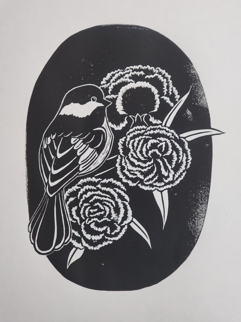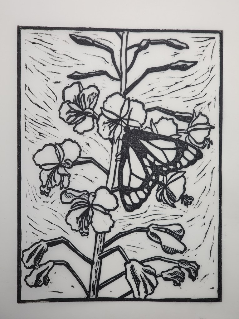 Green Lattice Moth and FireWeed, Linocut, June 2025